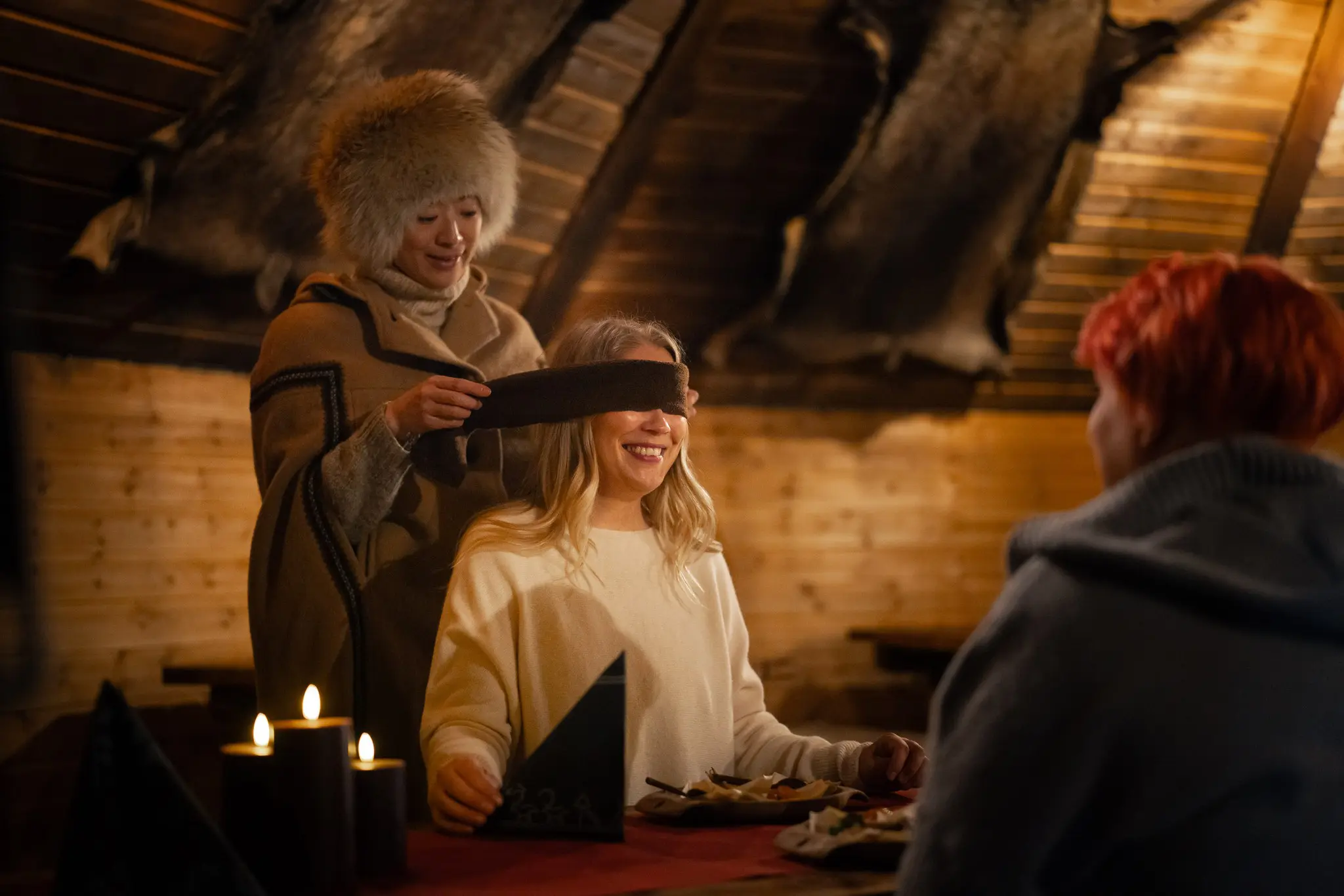 Soon you are welcomed into a traditional wooden hut, where the Guardian leads you through a blind tasting of Lappish delicacies. Familiar and unfamiliar flavors reveal themselves slowly, guided by the aromas, textures, and warmth of Arctic ingredients. Without sight, the essence of Lapland becomes even more vivid and intriguing, transforming each taste into a discovery.
