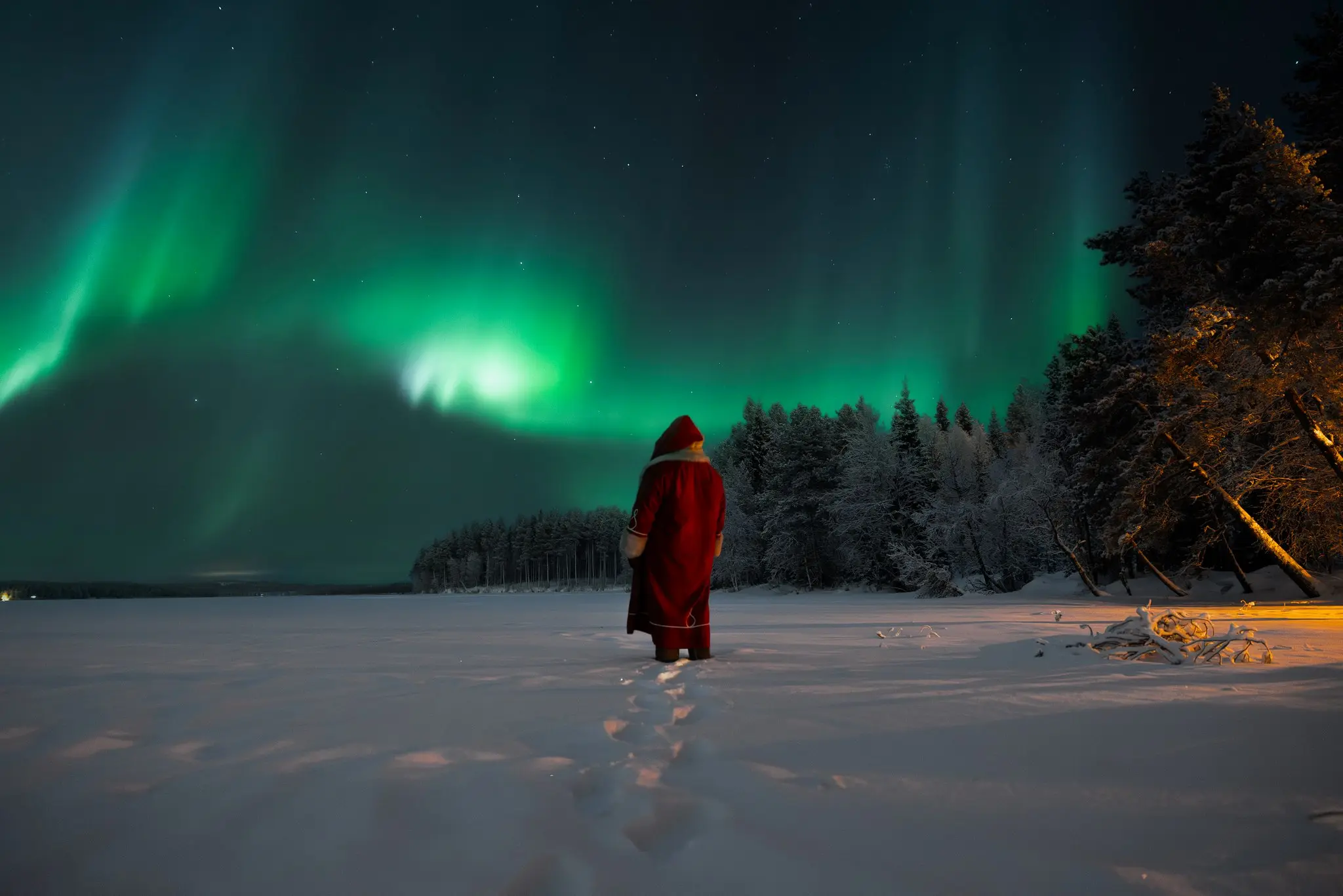 Santa Claus on a frozen lake witnessing Northern Lights. Rovaniemi, Lapland, Finland. | Santa Claus Secret ForestSanta Claus on a frozen lake witnessing Northern Lights. Rovaniemi, Lapland, Finland. | Santa Claus Secret Forest
